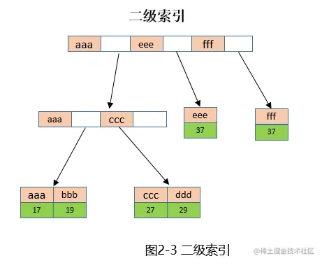 二级索引的组织方式对于InnoDB和MyISAM是一样的,保存了二级索引和主键索引的对应关系,二级索引列位于非叶子节点,主键值位于叶子节点,示意图如下: