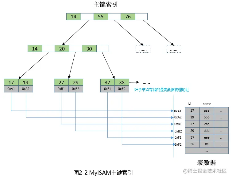 而MyISAM是堆组织表,主键索引和数据分开存放,叶子节点保存的只是数据的物理地址,示意图如下: