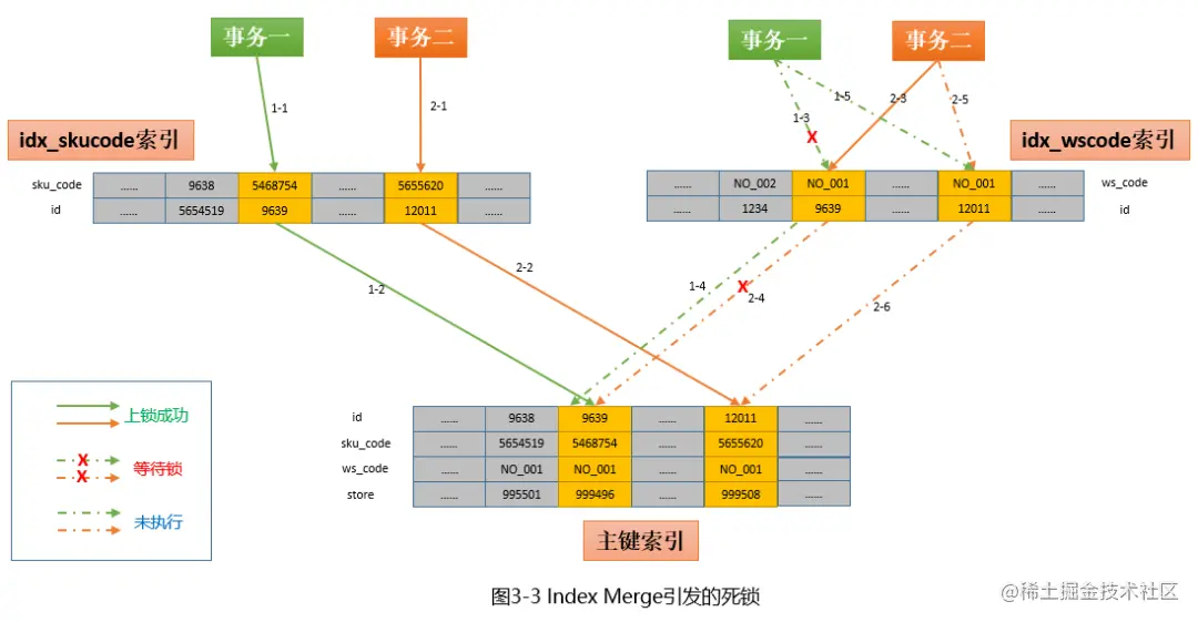 回到上面的update语句:where sku_code='5468754' and ws_code = 'NO_001' ;如果没有index_merge,要么走idx_skucode索引,要么走idx_wscode索引,不会出现两个索引一起使用的情况。而在使用index_merge技术后,会同时执行两个索引,分别查到结果后再进行合并(where条件是and,所以会做交集运算)。再结合第二部分对加锁机制(分步按记录加锁)的理解,是否隐约觉得两个索引的同时加锁是导致死锁的原因呢?