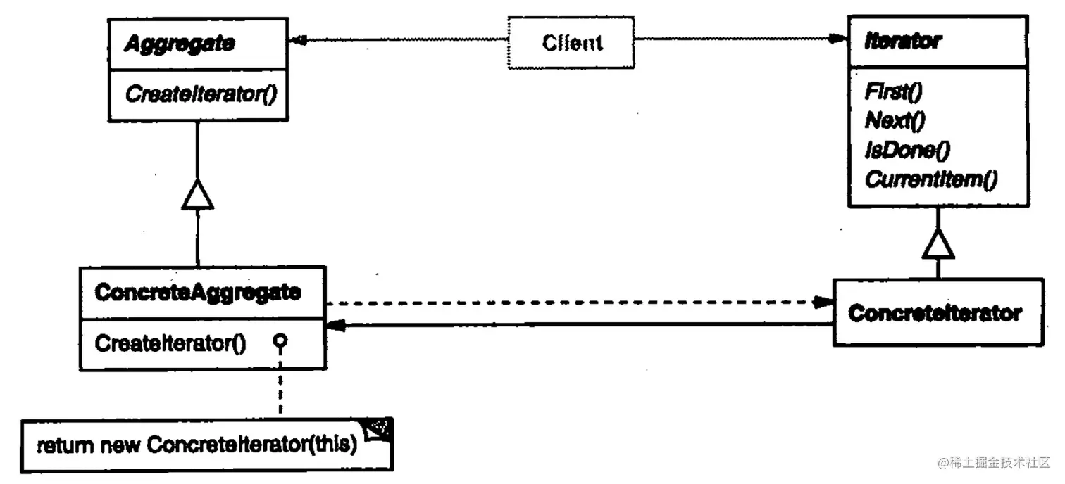 Aggregate: 聚合,需要定义创建迭代器的接口。比如前端规范的[Symbol.iterator](),或者这里定义的CreateIterator()。Iterator: 迭代器,定义了访问与遍历的 API。