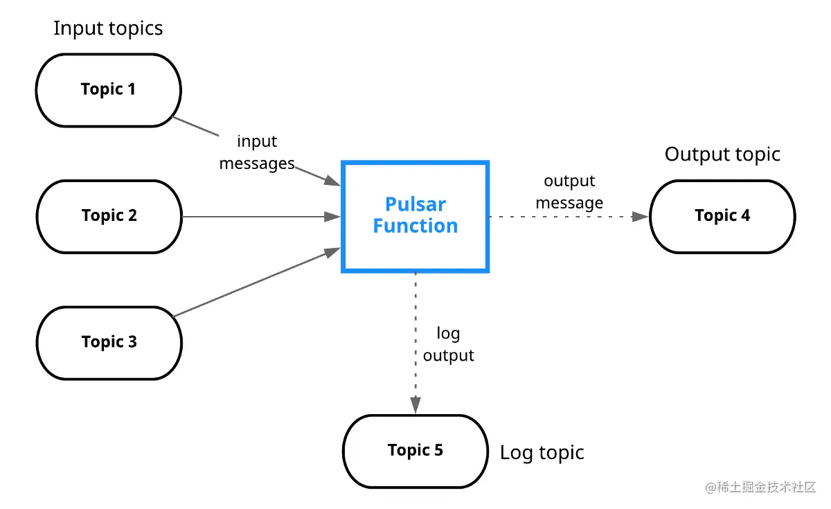 Pulsar Function 处理来自一个或多个 topic 的消息,对其进行转换并将结果输出到另一个 topic:
