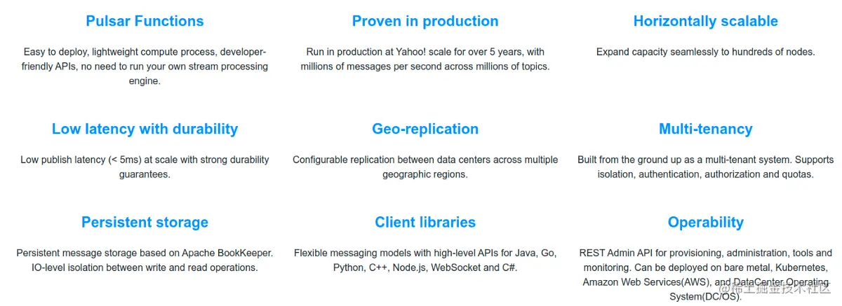 与 Kafka 相比,让我们回顾下 Pulsar 的主要优势: