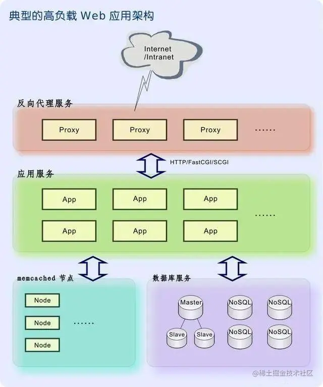 上图展示了一个典型的三层架构的高性能 Web 应用。这种成熟的架构多年以来已被广泛部署于包括 Google、Yahoo、Facebook、Twitter、Wikipedia 在内的诸多大型 Web 应用中。