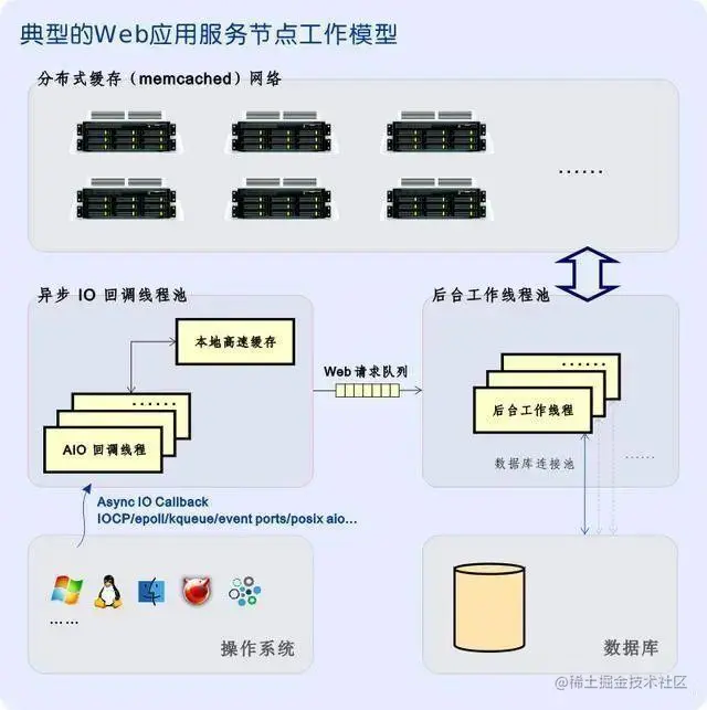 3、如果指定的 Web 请求要求查询的数据无法被本地缓存命中,或者这个 Web 请求需要数据库写入操作,则该请求将被 AIO 回调线程追加到指定的队列中,等待后台工作线程池中的某个空闲线程对其进行进一步处理。