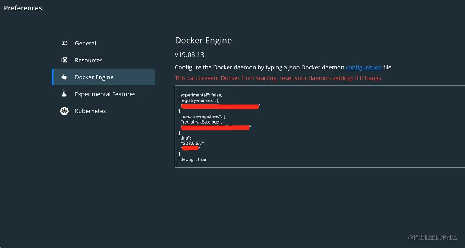 deamon.json配置文件 Mac电脑可以直接通过docker应用, Preferences—>Docker Engine 直接编辑配置即可: