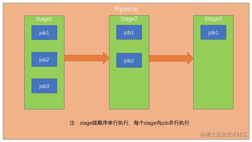 一个.gitlab-ci.yml文件触发后会形成一个pipeline任务流由gitlab-runner来运行处理,pipeline中stage、job概念如下,需要按照项目实际情况定义不同stage和job: