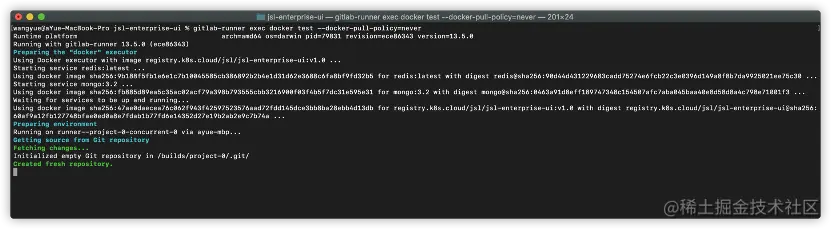 gitlab-runner exec docker为固定命令写法;test_job为.gitlab.yml中定义的一个job;--docker-pull-policy=never表示使用本地的docker镜像而非网络仓库