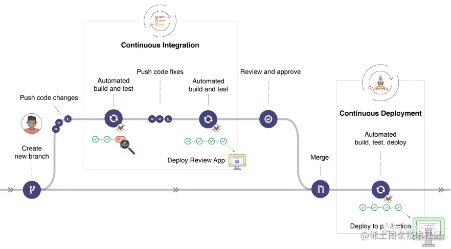 参考下图先了解CI/CD的具体工作流和概念,黄色部分为主要涉及的概念,将在后文重点说明: