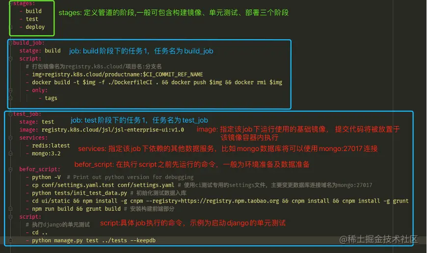 .gitlab-ci.yml文件中指定了CI的触发条件、工作内容、工作流程,编写和理解此文件是CI实战中最重要的一步,该文件指定的任务内容总体构成了1个pipeline、1个pipeline包含不同的stage执行阶段、每个stage包含不同的具体job脚本任务。