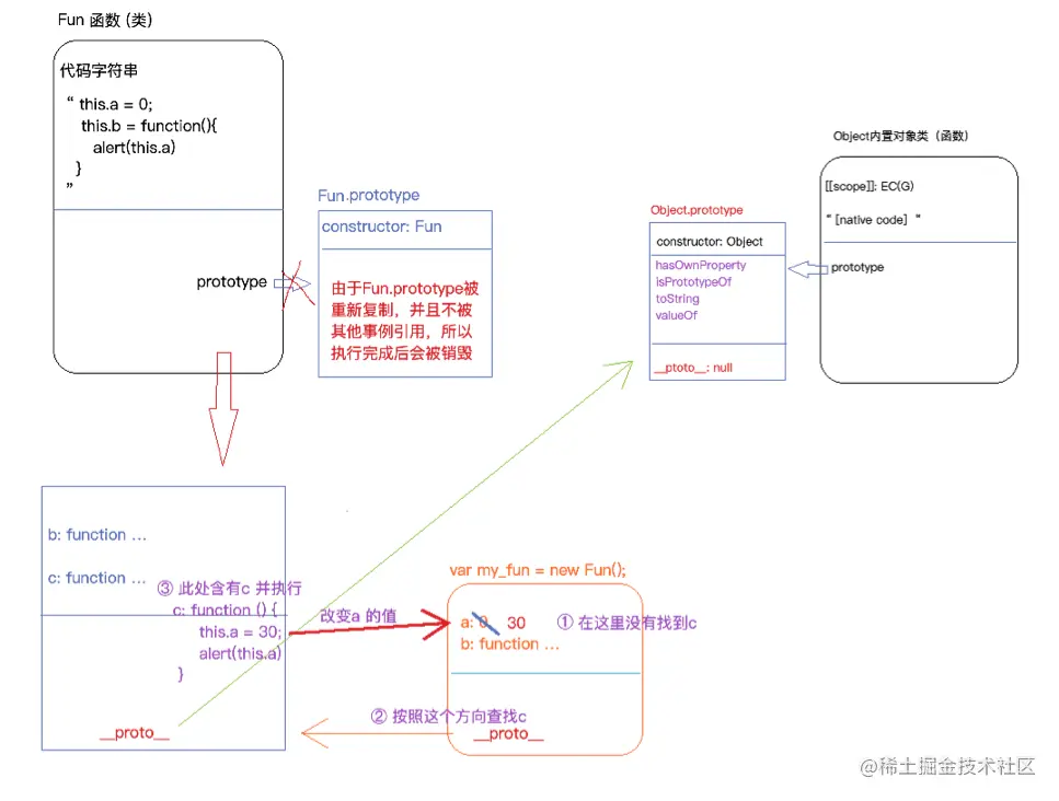 my_fun.c()按照原型链查找机制,在实例my_fun中并没有c,继续按照my_fun.__proto__向上查找,找到c并执行,this.a = 30,this为my_fun,所以此时实例中a 变为30,alert(this.a)值为字符串30