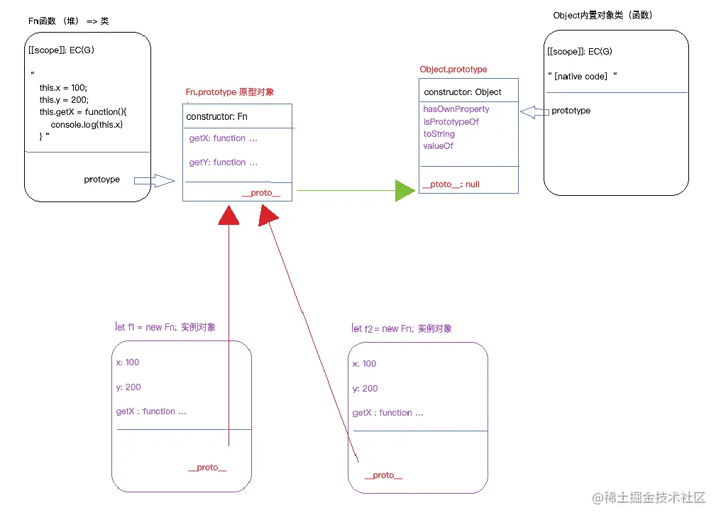 上图中Fn.prototype原型对象中__proto__没有指向,因此我们可以这样理解, ② 在不知道new谁出来的对象下多数的对象类型值都是Object内置类的一个实例,所以实例的__proto__指向Object的原型prototype