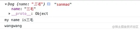 说明:首先由一个Dog类,在其prototype上添加了bark和sayName属性