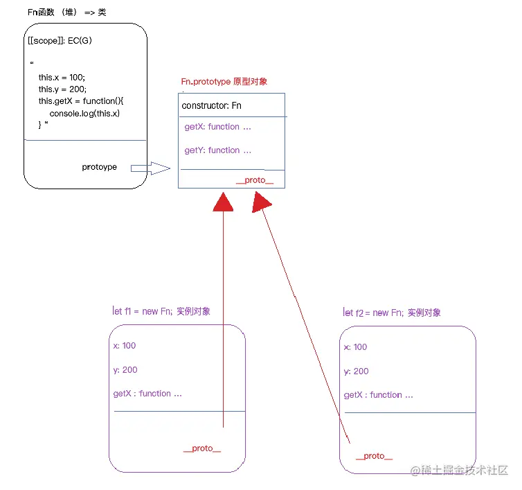 d.2. 创建实例f2,由实例.__proto__ === 类.portotype得 (如下图)