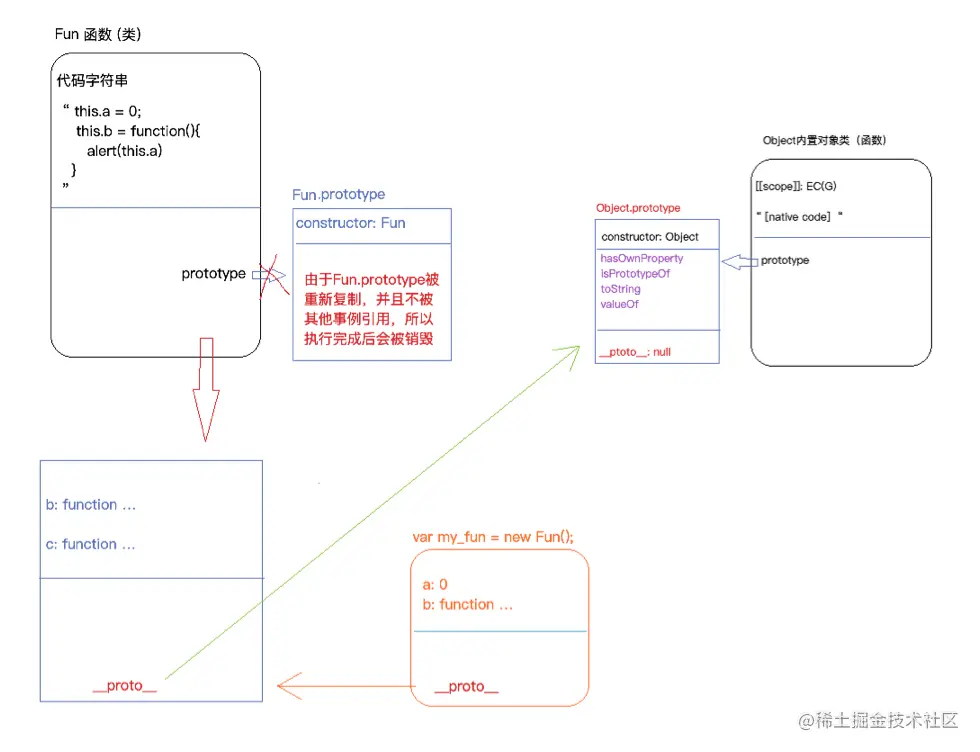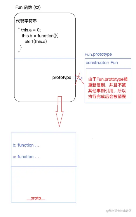 a. 首先创建一个函数Fun,然后在Fun的原型上进行了重新的复制操作,所以此时Fun.prototype便指向了新创建的对象,这一步重新操作就是原型重定向