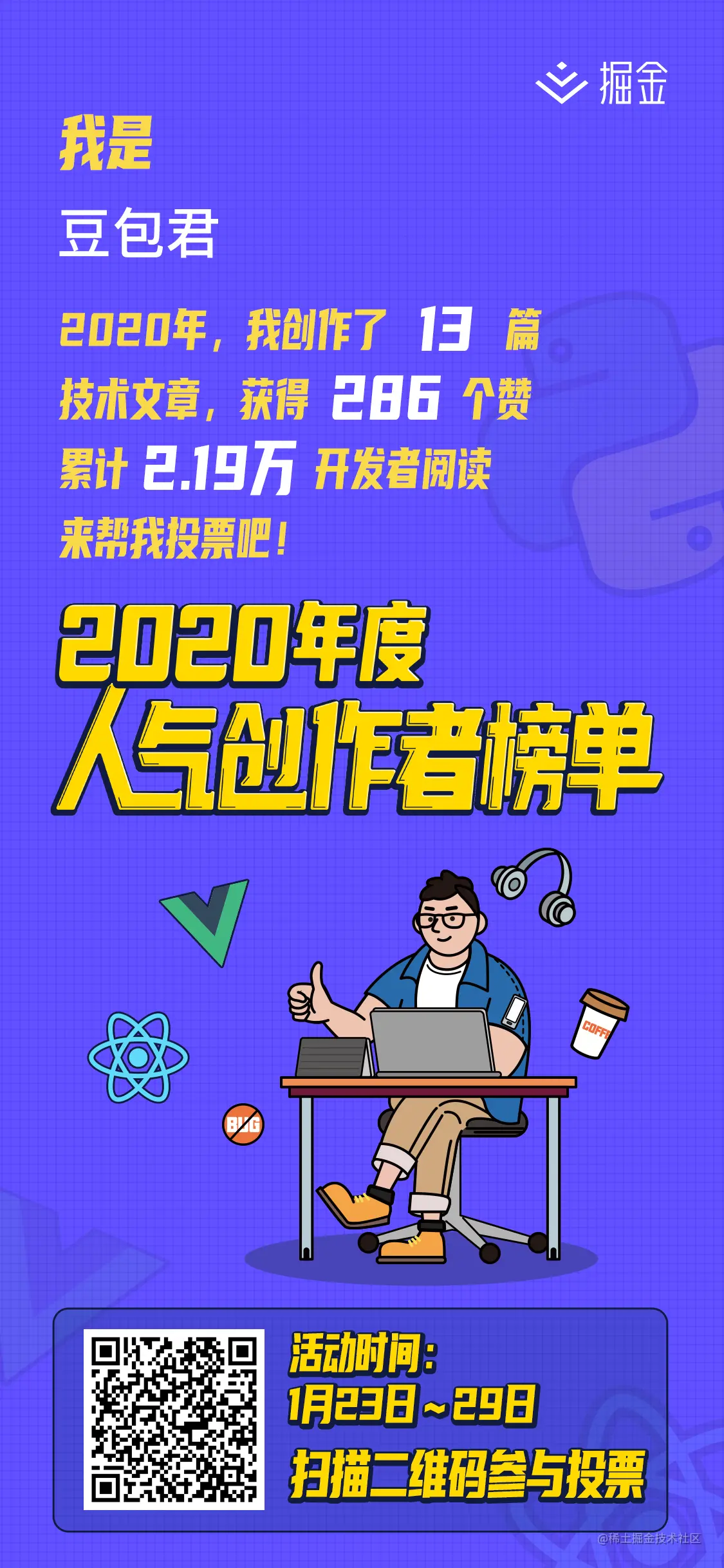 本人正在参与掘金2020年度人气创作者榜单排名,希望各位小伙伴帮我投票,2021年会给大家带来更多优质的文章,感谢大家。