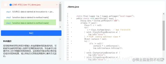 使用Wukong(悟空)软件代码安全检测修复系统检测上述程序代码,则可以发现代码中存在着不安全的反射安全漏洞,如下图:
