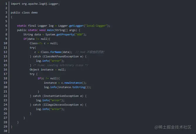 1、不可靠的外部输入进入程序; 2、程序使用外部输入进行实例化类并运行。 不安全的反射漏洞会造成哪些后果? 1、 攻击者可能能够执行攻击者无法直接访问的代码; 2、 攻击者可以在错误的位置或错误的时间调用其它代码,这可能会更改关键的系统状态。 3、 攻击者能够使用反射来调用错误的代码,使用违反API的意外参数,这可能导致应用程序退出或挂起。通过导致调用错误的代码,攻击者可能能够触发运行时错误,从而泄露错误消息中的敏感信息。