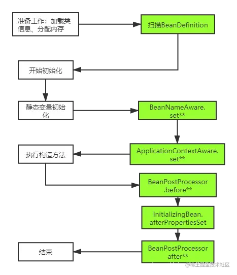 Spring Bean的初始化,除了创建对象这些步骤之外,还在其中穿插了一些生命周期的接口。首先在类加载完成后,会得到BeanDefinition,然后通过这个定义来初始化,而不是直接通过加载后的类对象来生成对象。在静态代码块和构造方法中间,Spring提供了几个Aware接口,如表格中的BeanNameAware和ApplicationContextAware。在构造方法调用结束,并且springboot给bean set了所有属性之后,会调用Initializing接口和BeanPostProcessor。