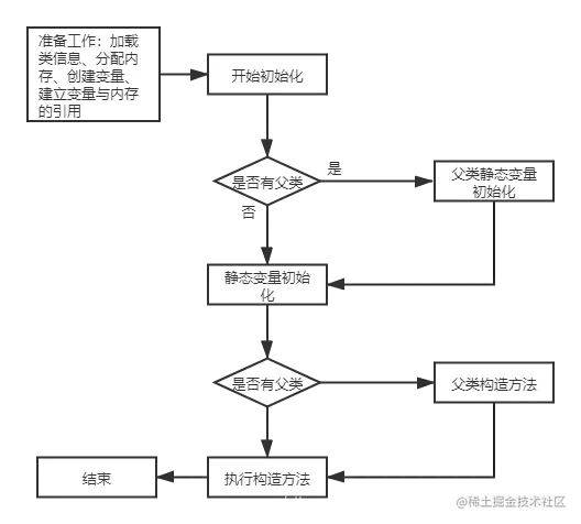 首先,一个对象是需要内存去存放的。所以会有一个分配内存的过程。分配了内存之后,jvm便会开始创建对象,并将它赋值给 a 变量。然后再去初始化A中的一些属性,并执行A的构造方法。在初始化的过程中,会先执行 static 代码块,再执行构造方法。除此之外,如果有父类,会优先父类的进行执行。大致如下图(图一)所示。