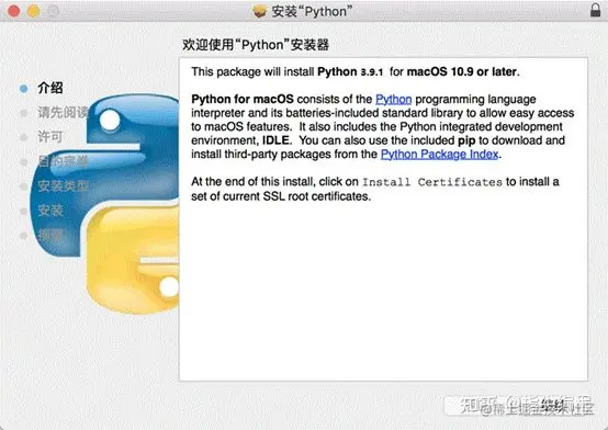 双击python-3.9.1-macosx10.9pkg就进入了Python安装向导,然后按照向导一步一步向下安装,所有保持默认即可。