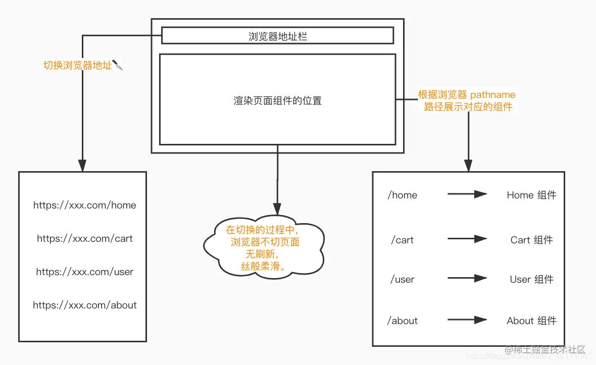 这时候 前端路由 应运而生,它的出现就是为了解决单页面网站,通过切换浏览器地址路径,来匹配相对应的页面组件。我们通过一张图片来理解这个过程