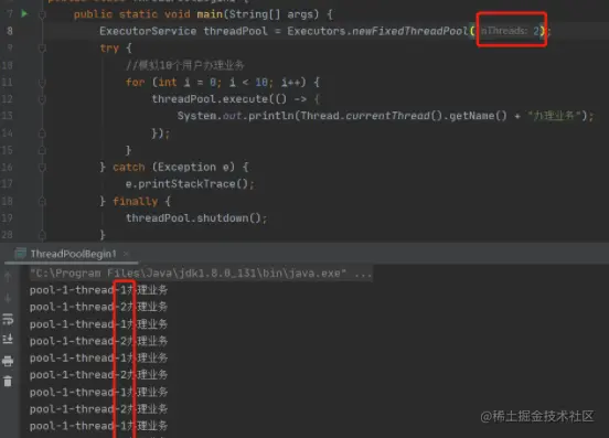 是吧,这十个任务都是通过我线程池里面两个线程处理的,其他三个创建线程池方式与此类似,我就不做多解释了;说白了就是这四种方式都不重要所以我不再赘述了;
