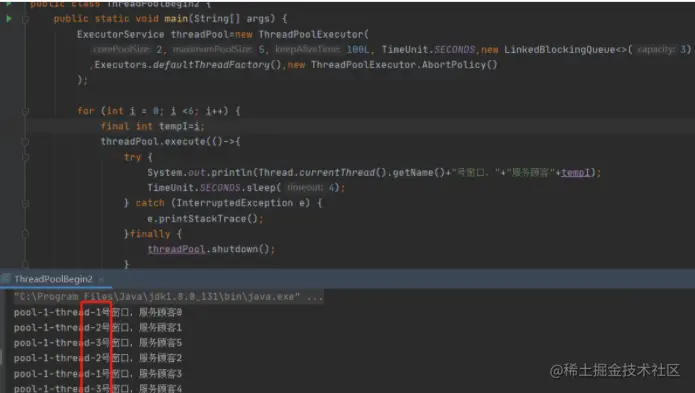 任何理论必须有实践来支撑,不然就是空话大话不务实,所以我们上代码,核心线程数2、最大线程5、阻塞队列3、这个时候我模拟6个请求,应该两个请求找核心线程、3个请求进入阻塞队列,剩余的一个开启一个最大线程,也就是只会有三个线程会执行任务,是不是这样子呢,看下图: