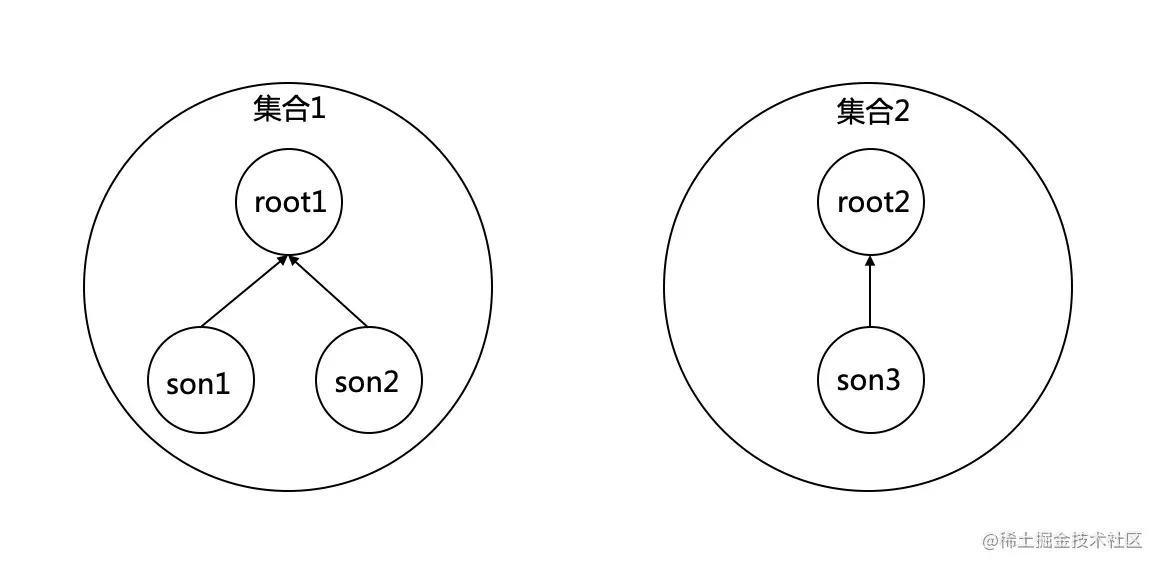 每个树有一个根,以不同的根代表不同的集合。如下,root1,root2代表两个集合。