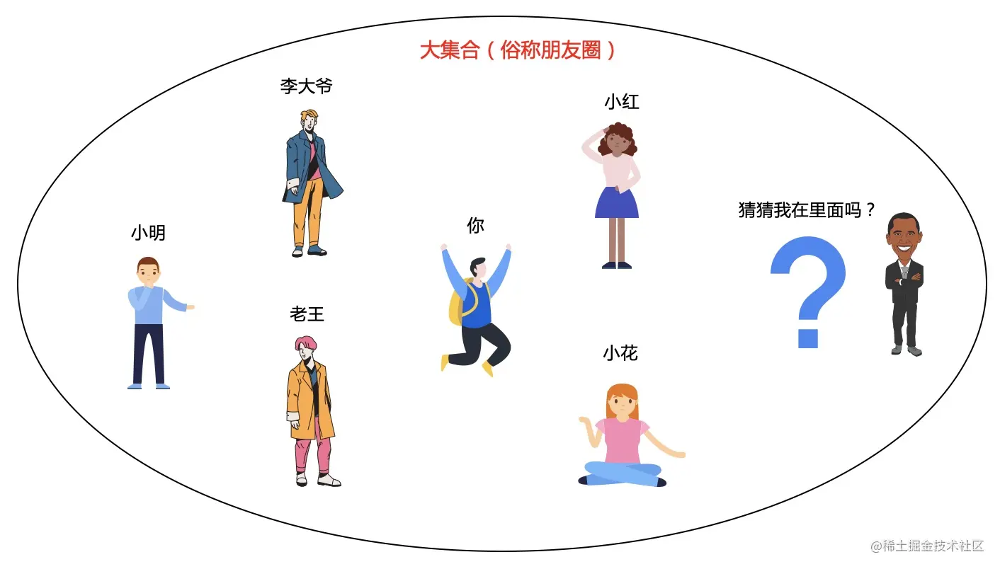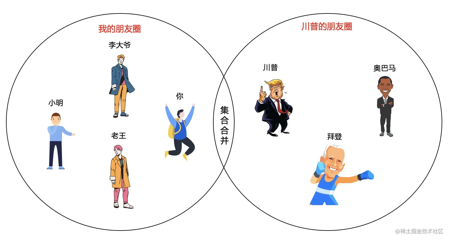 如果你的大朋友圈里面有人认识川普,那就要把川普的朋友圈里面的所有人都加进来,形成一个新的朋友圈。