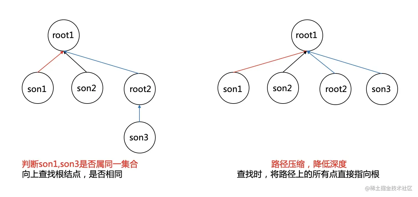 判断2个元素是否属同一集合,只需向上查找根,再判断是否相同。