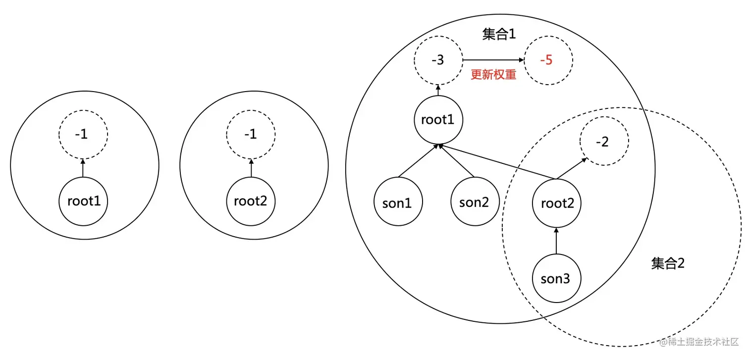 初始时,每个元素都属于一个独立的集合,该元素作为根。每个根指向一个虚拟根-n,代表权重(表示该集合有n个元素)。