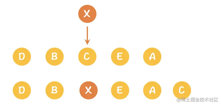 但是,如果我们明确要求来的 X 排到指定位置(关系户 →_→),但是对原来的队伍不关心顺序(可能原本就是无序)。可以采用如下方式,比如 X 确定排第三,那么我们可以先让 C 排到最后,再把第三个位置给 X 即可。