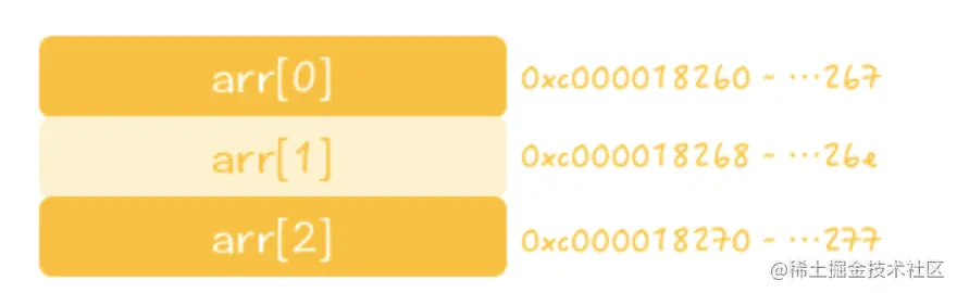 其中 data_type_size 表示数组中每个元素的大小。上例, go int 类型数据为8个字节(64 位)。