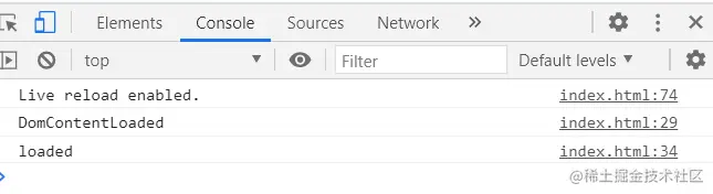 很显然,DomContentLoaded先执行,而loaded后执行。产生这种状况是由于当“document.addEventListener('DOMContentLoaded',()=>{” 执行的时候,DOM和CSS结合完成了,显示静态页面,早一点输出;而当“window.addEventListener('load',()=>{”执行的时候,需要加载各种资源,如js,img,src...,要花大量的时间,所以运行输出较慢。