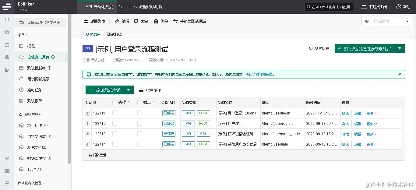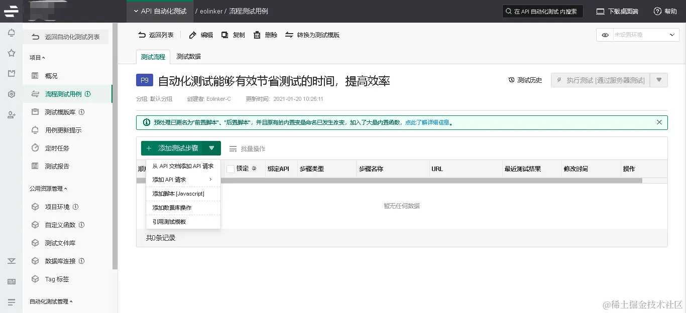 自动化测试脚本是进行更快,更准确的测试的依据。 较小的测试可以被较大的测试扩展或重用为模块,这减少了为应用程序更改而更新测试所需的维护量。确保充分利用自动化测试工具的功能。例如,Eolinker允许一个测试脚本运行另一个,从而使你的测试脚本更具模块化和可维护性。
