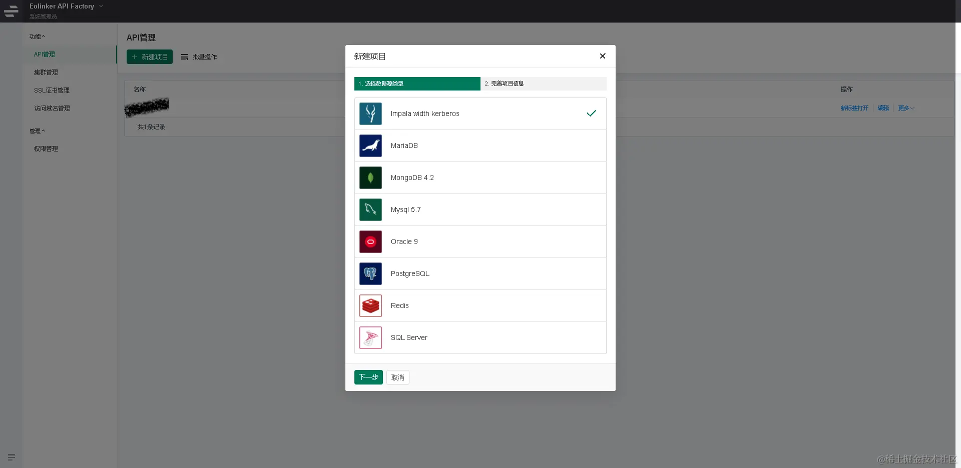 API也可以使用工具生成,如果项目需要快速对数据库进行查询,如在测试后查询数据库是否按测试要求正常插入数据,则可以使用工具进行生成。工具生成API操作比较简单,只需要选择相应的数据库,填写相关的数据库信息,创建项目。