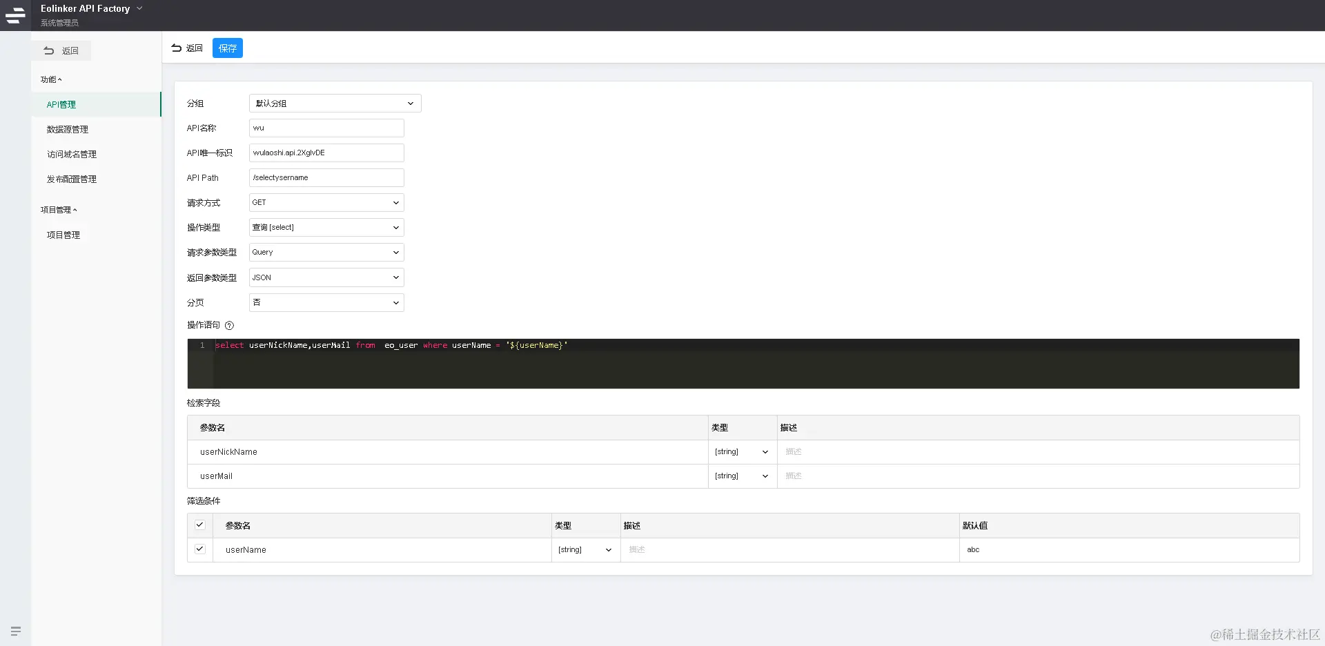 项目创建好后,即可创建API,在创建API页面根据使用场景选择API的请求方式等信息,若需要使用API进行前端开发,如进行登录操作,可以创建POST请求。下图为测试获取用户信息使用GET请求,编写SQL语句进行查询。