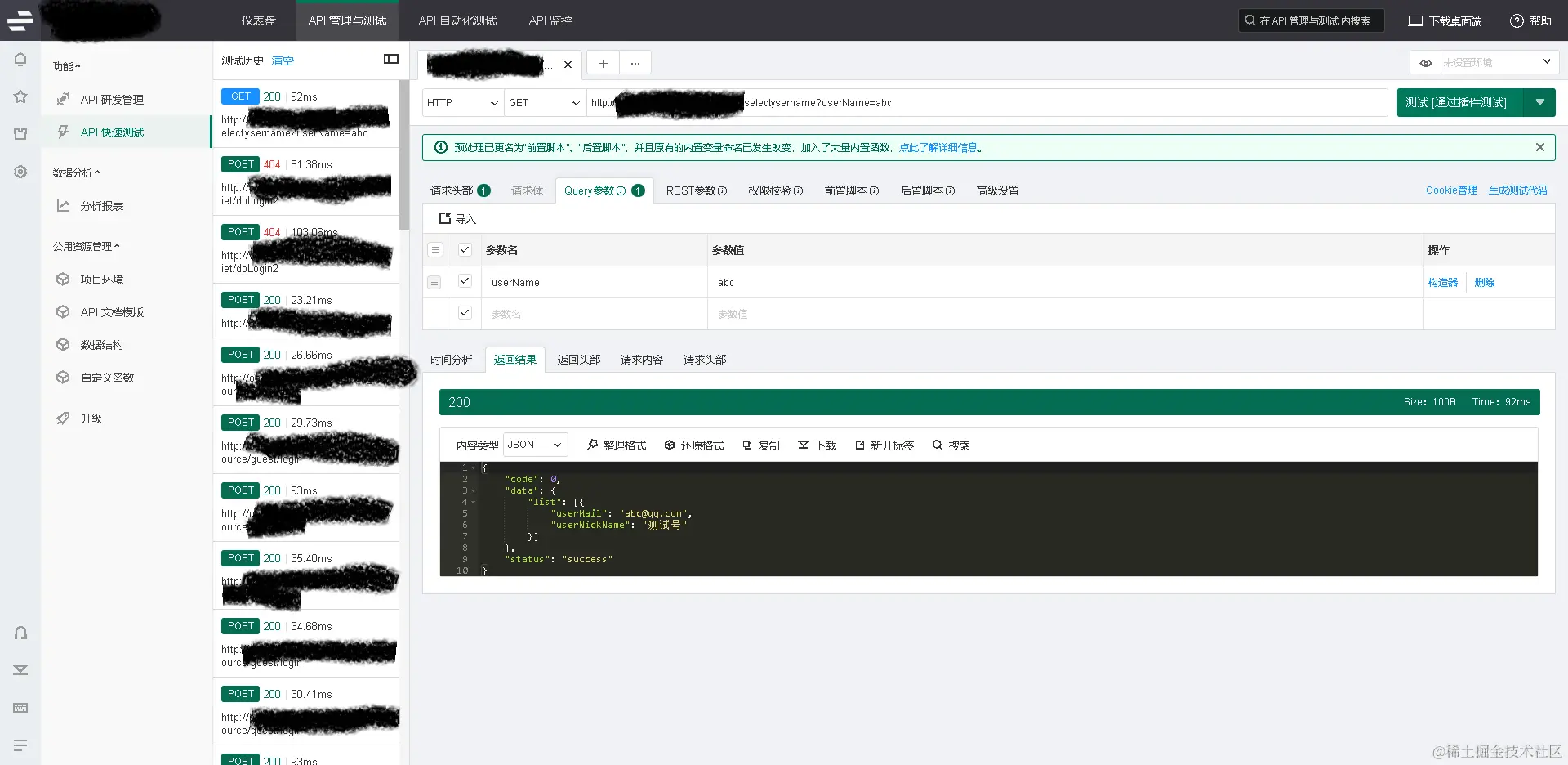 只需要简单的步骤即可创建好一个API,创建后的API可用于研发或正式投入使用。下图使用API测试工具进行测试,填写URL与请求参数,测试后可以返回数据库中该用户信息。
