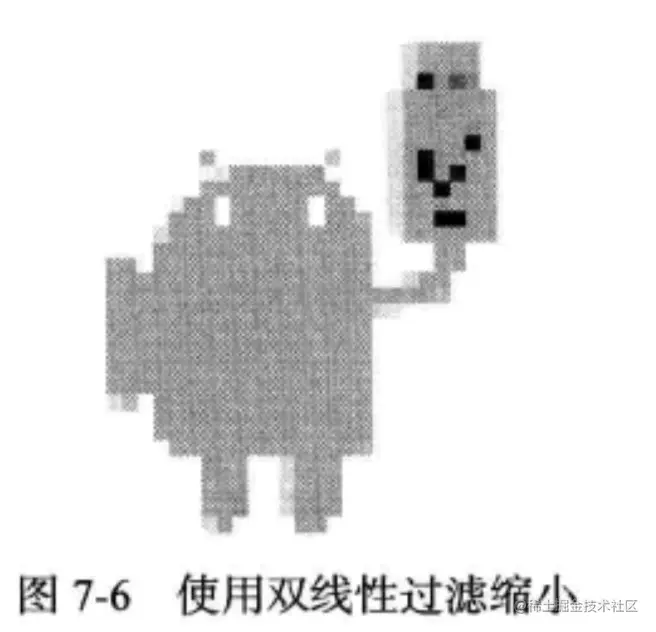 这个方式每个片段选择最近的纹理元素,当我们放大纹理时,他的锯齿效果看起来很明显,每个纹理单元都清楚的显示一个小方块,当我们缩小纹理时,因为没有足够的片段绘制所有的纹理单元,许多细节会被丢失,如下图:
