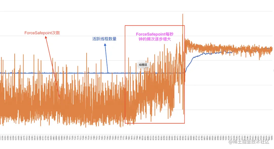 依据JVM日志中统计了每一分钟的ForceSafepoint次数,以及线程总数的变化。将两条曲线叠加在一起,得到下图:
