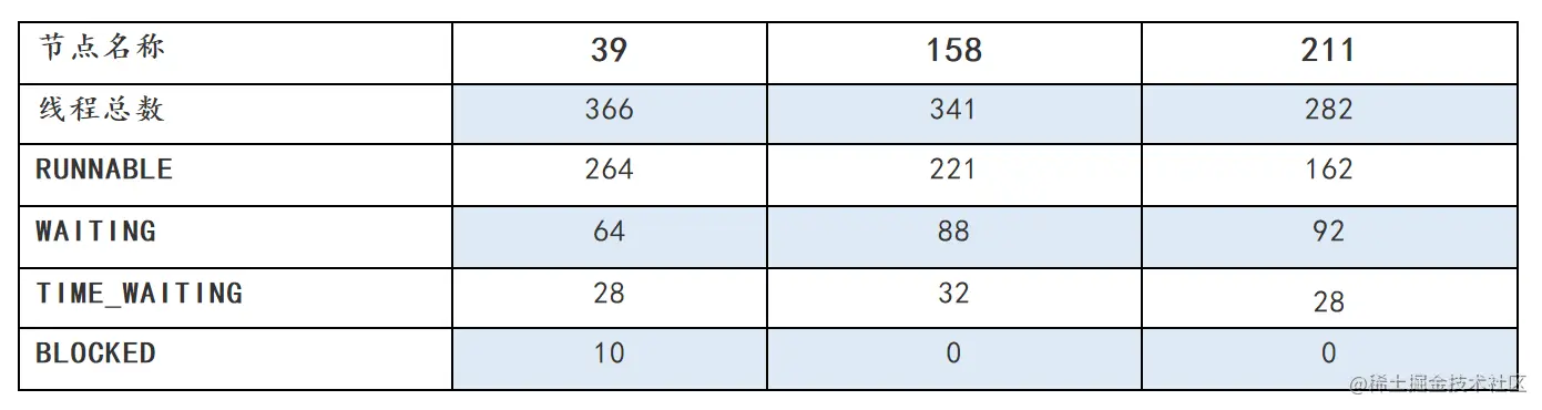 再对39节点的Thread Dump文件进行深入分析,发现的异常点总结如下: