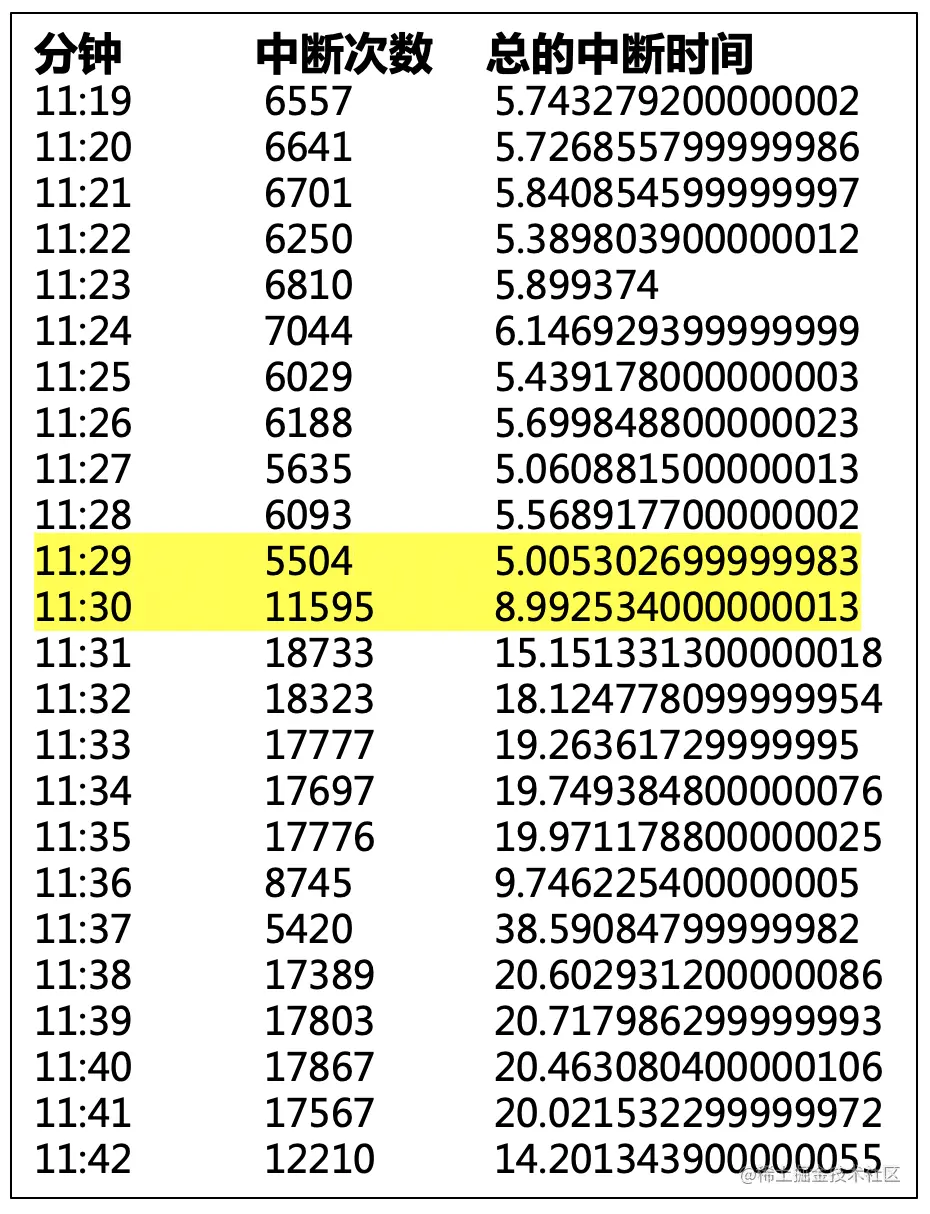 在11:29~11:30之间,中断频次陡增,这恰恰是问题现象开始出现的时间段。每分钟的中断总时间甚至高达20~30秒。