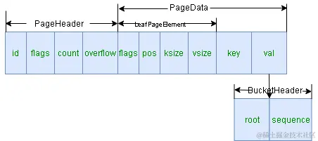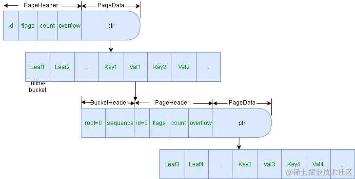 bucket和其中的数据做为一个leafPageElement存在。假设leaf1为inline-bucket,则其value值中存储的内容为BucketHeader+PageHeader+PageData(该bucket的k/v集合).