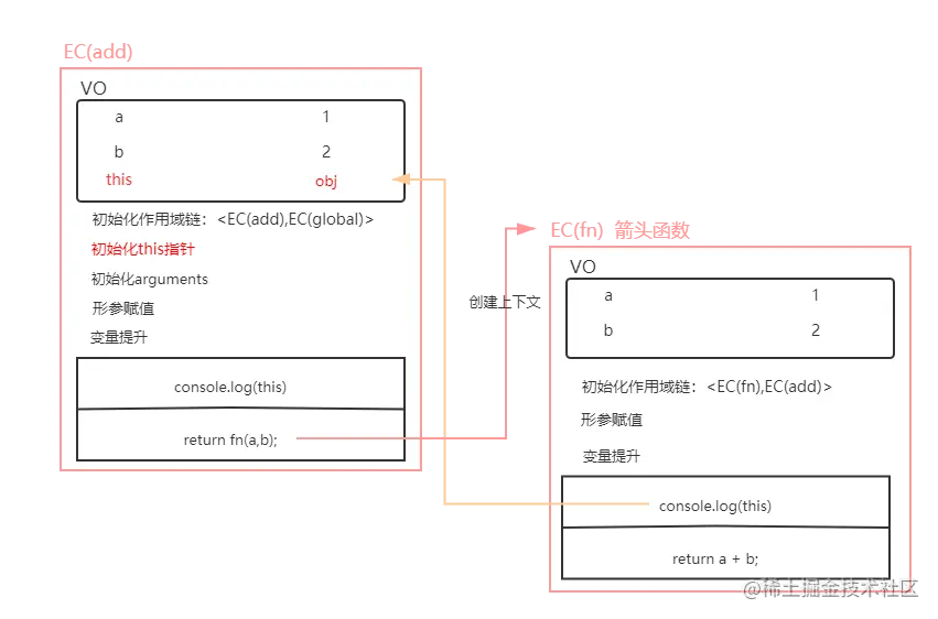 箭头函数在创建执行上下文的时候,在初始化上下文环境时,不会创建this属性,所以在箭头函数中如果使用到