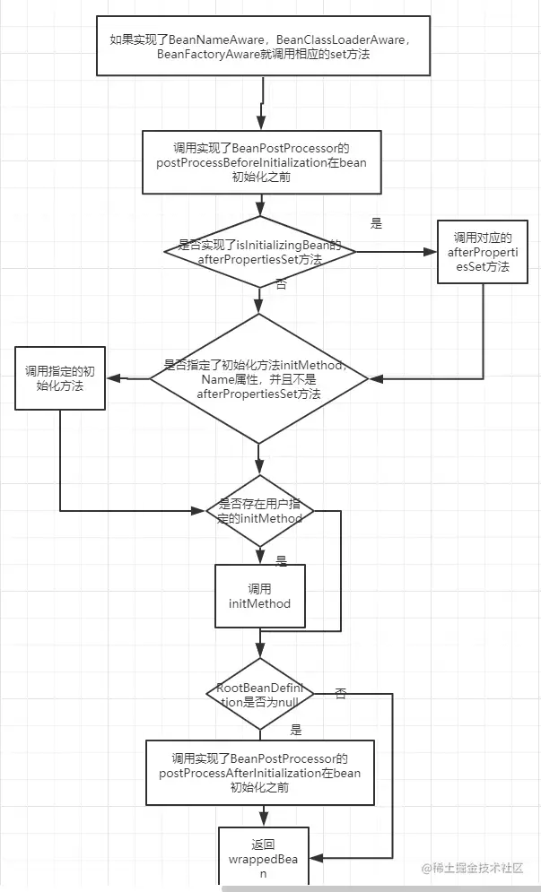BeanPostProcessor的postProcessBeforeInitialization则会调用实现的postProcessBeforeInitialization方法。在ApplicationContextAwareProcessor类中实现了postProcessBeforeInitialization方法。而这个类会在Spring刷新容器准备beanFactory的时候会加进去,这里就会被调用,而调用里面会检查Bean是不是EnvironmentAware,EmbeddedValueResolverAware,ResourceLoaderAware,ApplicationEventPublisherAware,MessageSourceAware,ApplicationContextAware的实现类。这里就会调用对应的实现方法。代码如下protected void prepareBeanFactory(ConfigurableListableBeanFactory beanFactory) { ....... beanFactory.addBeanPostProcessor(new ApplicationContextAwareProcessor(this)); ....... public Object postProcessBeforeInitialization(Object bean, String beanName) throws BeansException { if (!(bean instanceof EnvironmentAware || bean instanceof EmbeddedValueResolverAware || bean instanceof ResourceLoaderAware || bean instanceof ApplicationEventPublisherAware || bean instanceof MessageSourceAware || bean instanceof ApplicationContextAware)){ return bean; } AccessControlContext acc = null; if (System.getSecurityManager() != null) { acc = this.applicationContext.getBeanFactory().getAccessControlContext(); } if (acc != null) { AccessController.doPrivileged((PrivilegedAction<Object>) () -> { invokeAwareInterfaces(bean); return null; }, acc); } else { invokeAwareInterfaces(bean); } return bean; } -