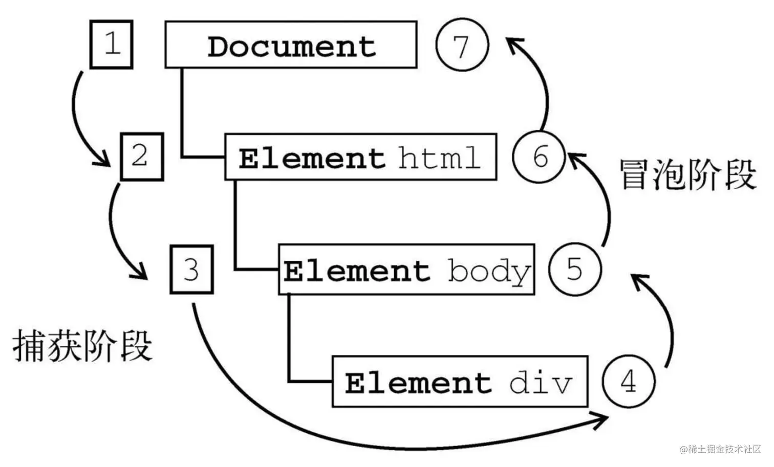 在DOM事件流中,实现的目标(div元素) 在捕获阶段不会接收到事件。是因为捕获阶段从 document到 html再到body就结束了。