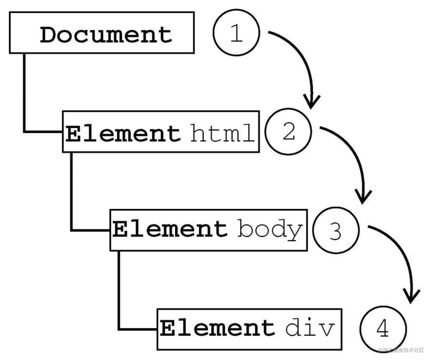 <div>➡️ 2 <body> ➡️ 3<html> ➡️ 4 document