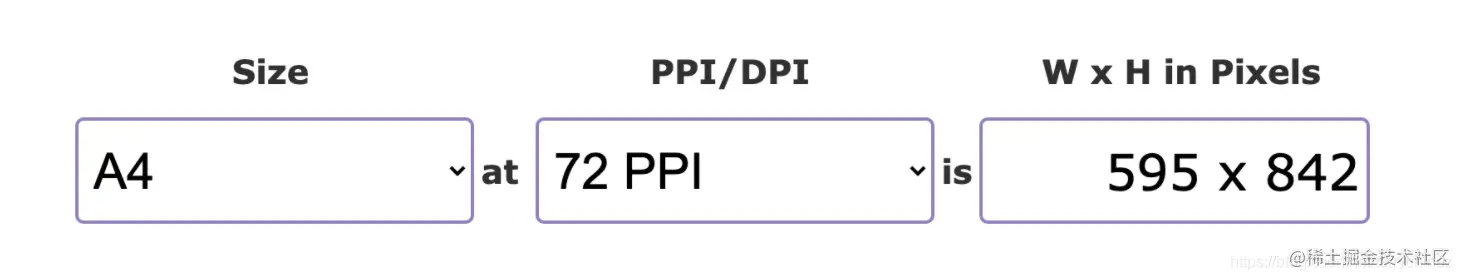 1 英寸=25.4 毫米, 在 72 dpi 的屏幕下,A4的宽度 width 和高度 height 如下计算