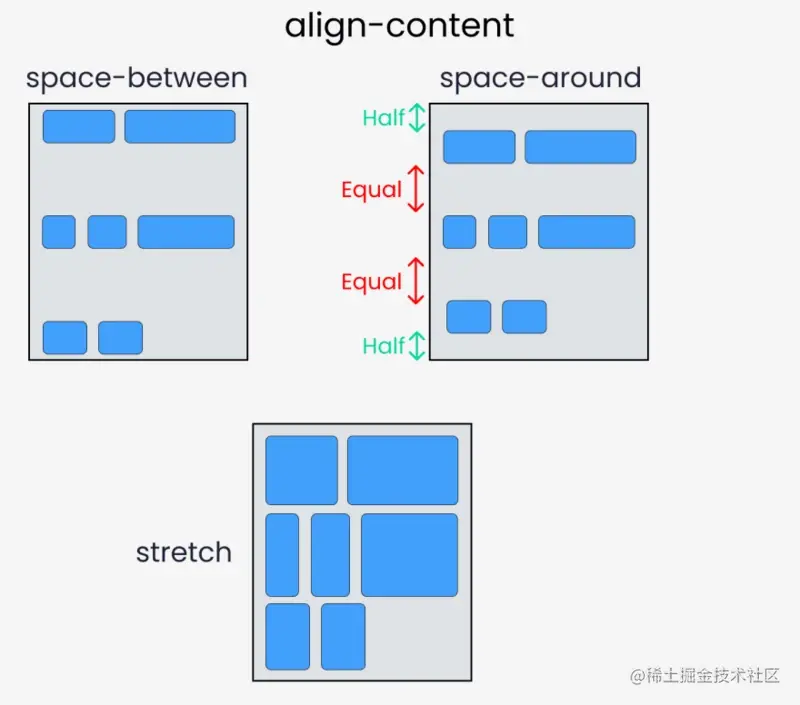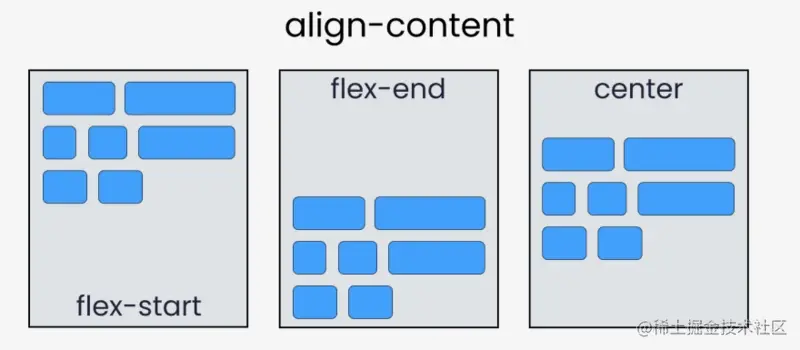 align-items适用于单行情况下,只有上对齐,下对齐,居中和拉伸align-content适应于换行(多行)的情况下(单行情况下无效),可以设置对齐,下对齐拉伸以及平均分配剩下空间等属性值。- 总结就是单行找