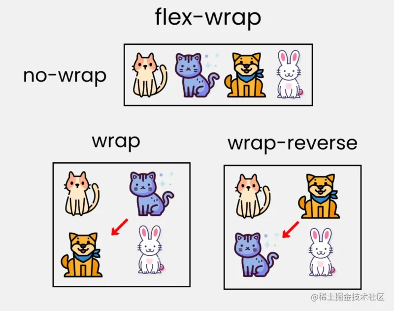 flex-wrap 指定 flex 元素单行显示还是多行显示 。如果允许换行,这个属性允许你控制行的堆叠方向。